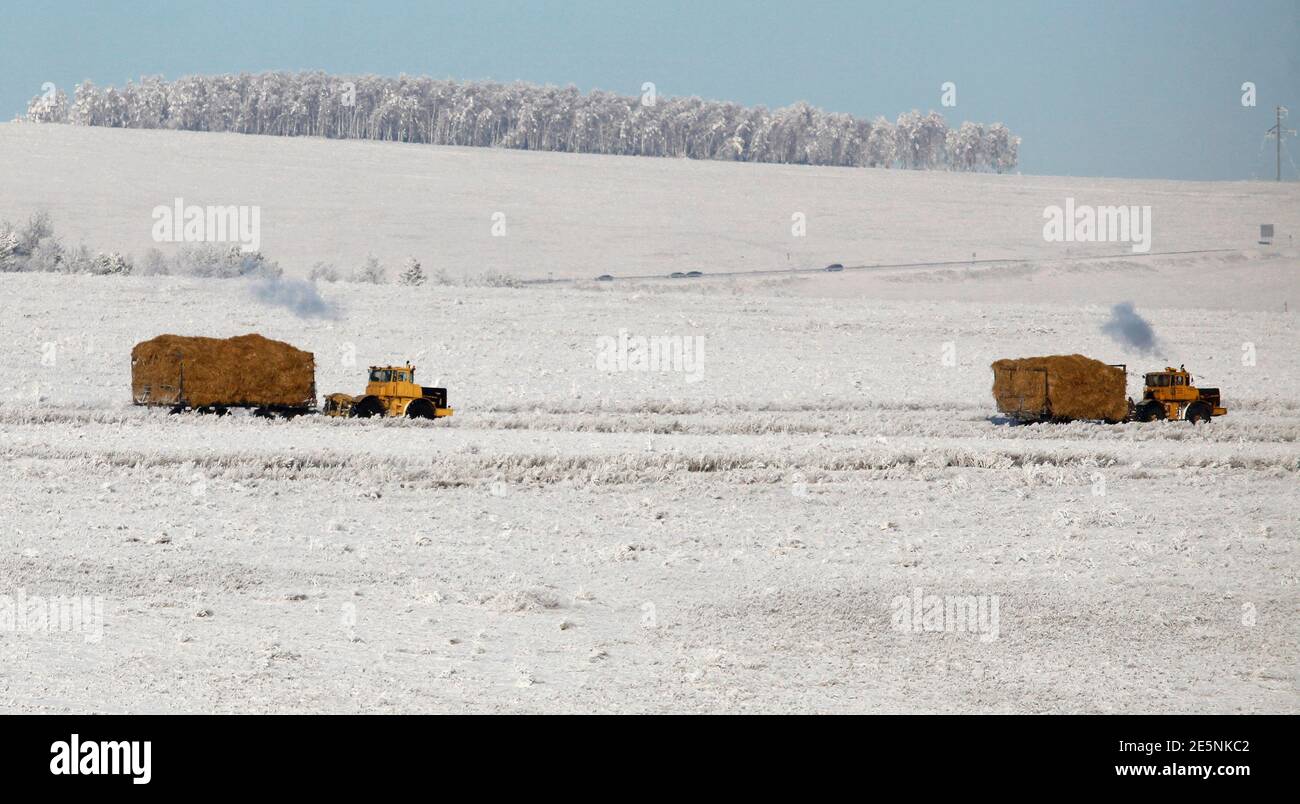 Tractors Transport Hay Near The Settlement Of Novosyolovo With The Air Temperature At About 27 Degrees Celsius 16 6 Degrees Fahrenheit Some 250 Km 155 Miles South Of Russia S Siberian City Of Krasnoyarsk
